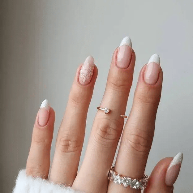 - Frosted. La idea de este es representar los copos de nieve que se pueden hacer sobre una manicura francesa, se pinta un copo de nieve y algunos puntos blancos de fondo.