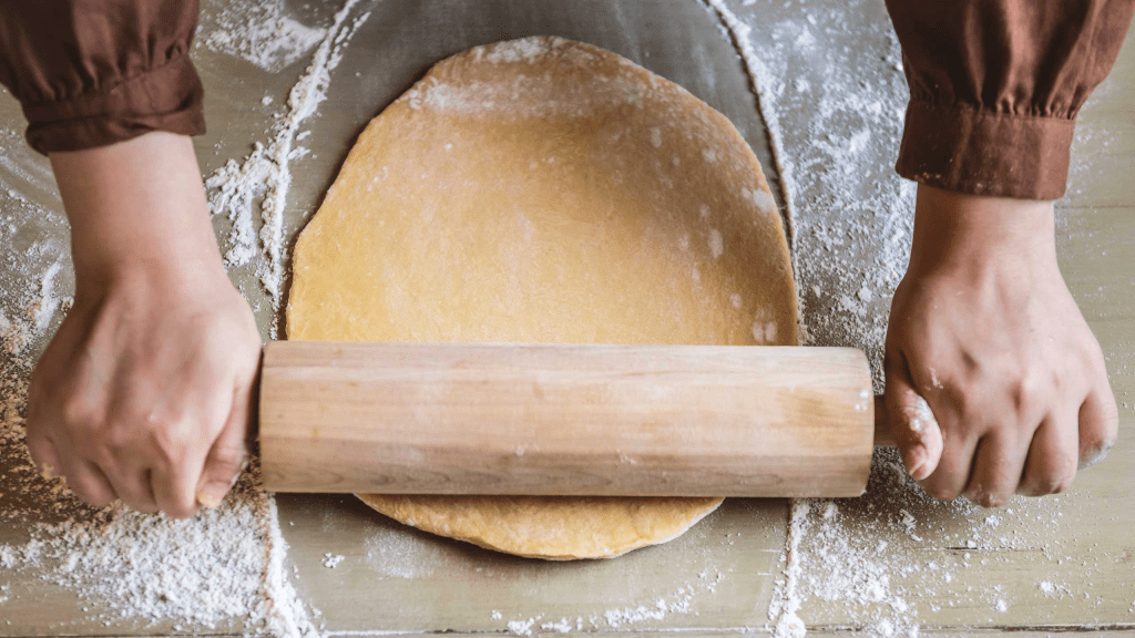 - Pasado el tiempo de reposo, pasamos la mezcla a una superficie espolvoreada con un poco de harina y la estiramos con un rodillo, hasta que quede una capa de aproximadamente dos milímetros de grosor.