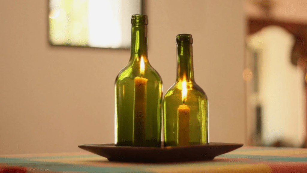 - Candelabros. Esta primera propuesta es bastante fácil y tienes dos maneras posibles de hacerlo. Una, simplemente colocando la vela en la boca de la botella; o dos, posicionado la vela dentro de la botella, para encenderla debes ayudarte de una antorcha desechable. Puedes decorar como desees u optar por un diseño sobrio, es decir, conservar el color original de la botella.