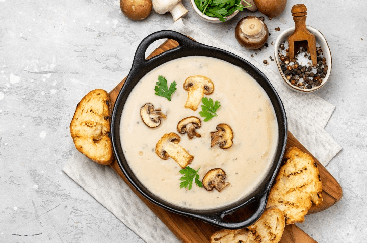 Sin duda no pueden faltar las deliciosas cremas en estas fiestas y una buena opción es una sopa cremosa de setas. Para prepararlas solo debes limpiar las setas, luego las pones a fuego lento junto con cebolla y mantequilla. Aparte calienta en una olla nata líquida, hasta que hierva, así tienes una ligera salsa; después sírvela con las setas encima.